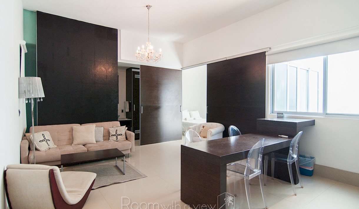 This lovely, one bedroom, one bath residence is situated on the ground level of a modern condominium building in the heart of downtown Playa del Carmen. It features an open plan living-dining area and a fully equipped kitchen. High ceilings and large windows make this modern condo feel bright and airy. The bedroom has built in closets and sliding glass doors that open onto a lovely, private patio with a jacuzzi-style tub.