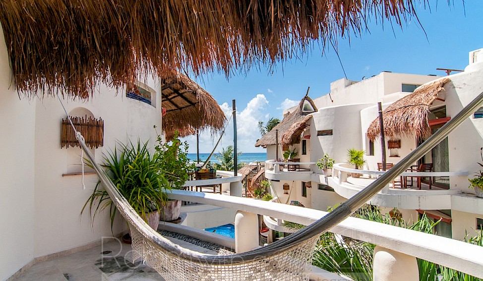 This lovely studio is located in a popular beachfront condo-hotel in the heart of downtown Playa del Carmen. You or your guests can spend the day lounging under a palm tree on the white sandy beach and cooling off in the clear Caribbean waters, just steps from the property. The building features traditional Mexican style and lots of "Old Playa" charm. This bright and airy unit is located on the top floor and has a nice sized balcony with a hammock that overlooks the pool area.