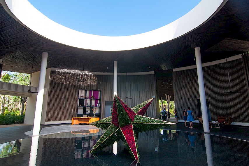 The layout of the lobby and lounge area, with its circular water feature and oculus at the center, is inspired by the region’s ancient cenotes and the importance of astrology in Mayan culture; and the natural materials, colors, textures and finishes used throughout the resort property help to create a soothing atmosphere that blends in perfectly with the lush jungle setting.