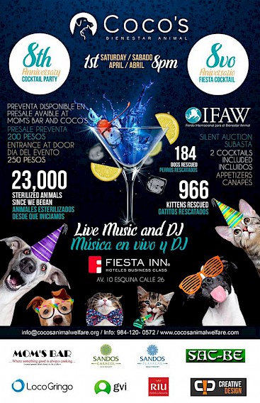Mark your calendars! On April 1, 2017 Coco’s Animal Welfare is hosting its 8th Anniversary Cocktail Party in Playa del Carmen. There will be live music, a raffle, and a live and online auction. This is a fantastic opportunity to come out and help support this wonderful local non-profit.
