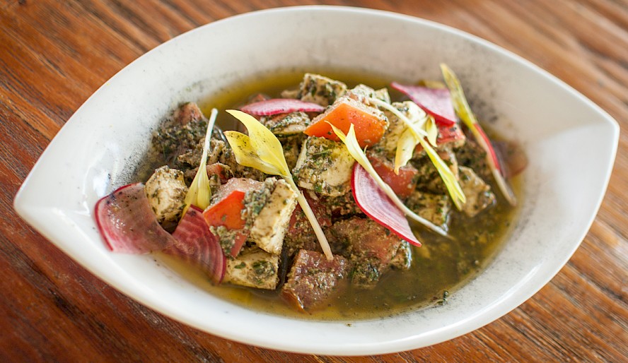 The tasty beet carpaccio is certainly a must try! Beet carpaccio, with mustard seeds, banana vinegar and caramelised pistachios, all this with the option to bathe it with a fake cream based on coconut milk and ginger.