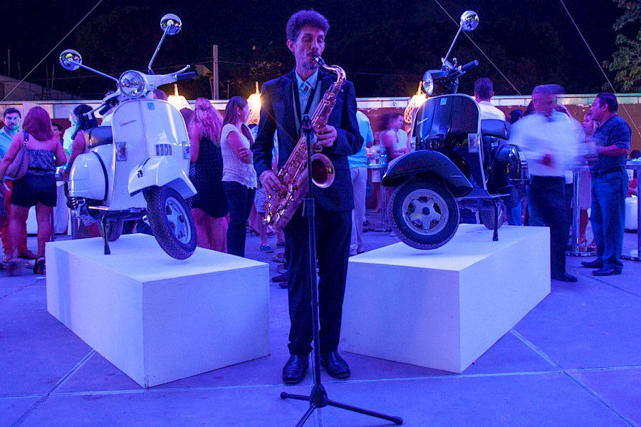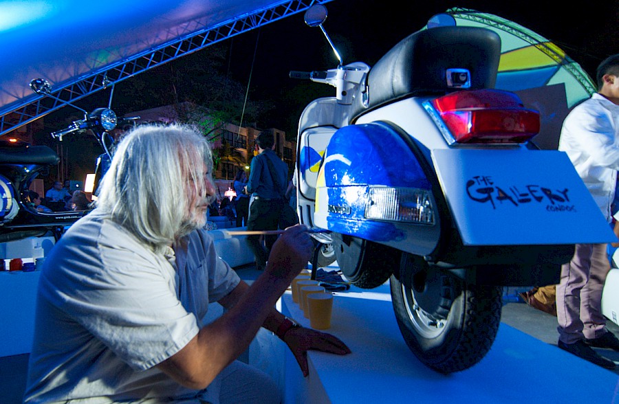 Immediately we were blown away by the atmosphere, where the construction site had been decked out for an elegant real estate event for over 600 guests, all hosted by GMB (Gama Master Broker) and Habitania. Gorgeous lighting and white tents set the mood for a fashionable evening, reminiscent of the sleek design that will be used in the condos once they are complete. We even got to enjoy with live saxophone and violin music, plus see The Gallery’s two main artists Jobacasen and Reyna Castaño decorating a scooter by Italian sponsor Vespa.