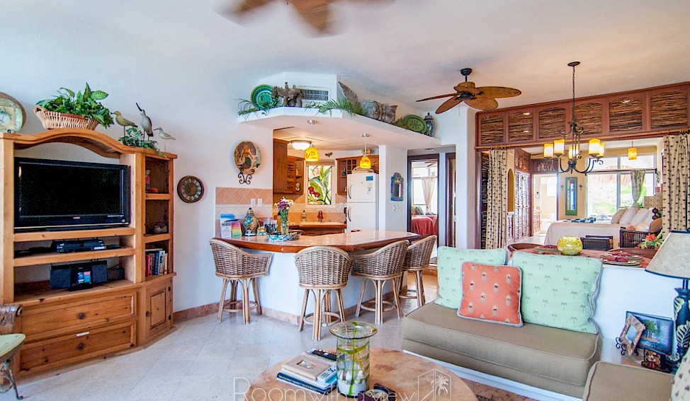 This charming two-bedroom vacation condo is located right on the bay in Akumal and within easy walking distance of restaurants, bars, dive centers, spas, yoga studios, and more. It boasts an open floor plan and incredible ocean views from the living room and kitchen. It is currently being used as a vacation rental and runs a strong and profitable rental program.