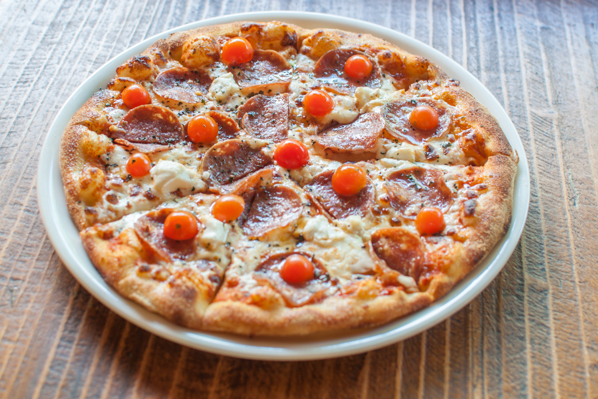 Pizza Salamino: Tomato sauce, spicy Italian salami, fresh tomato, mozzarella and goat cheese