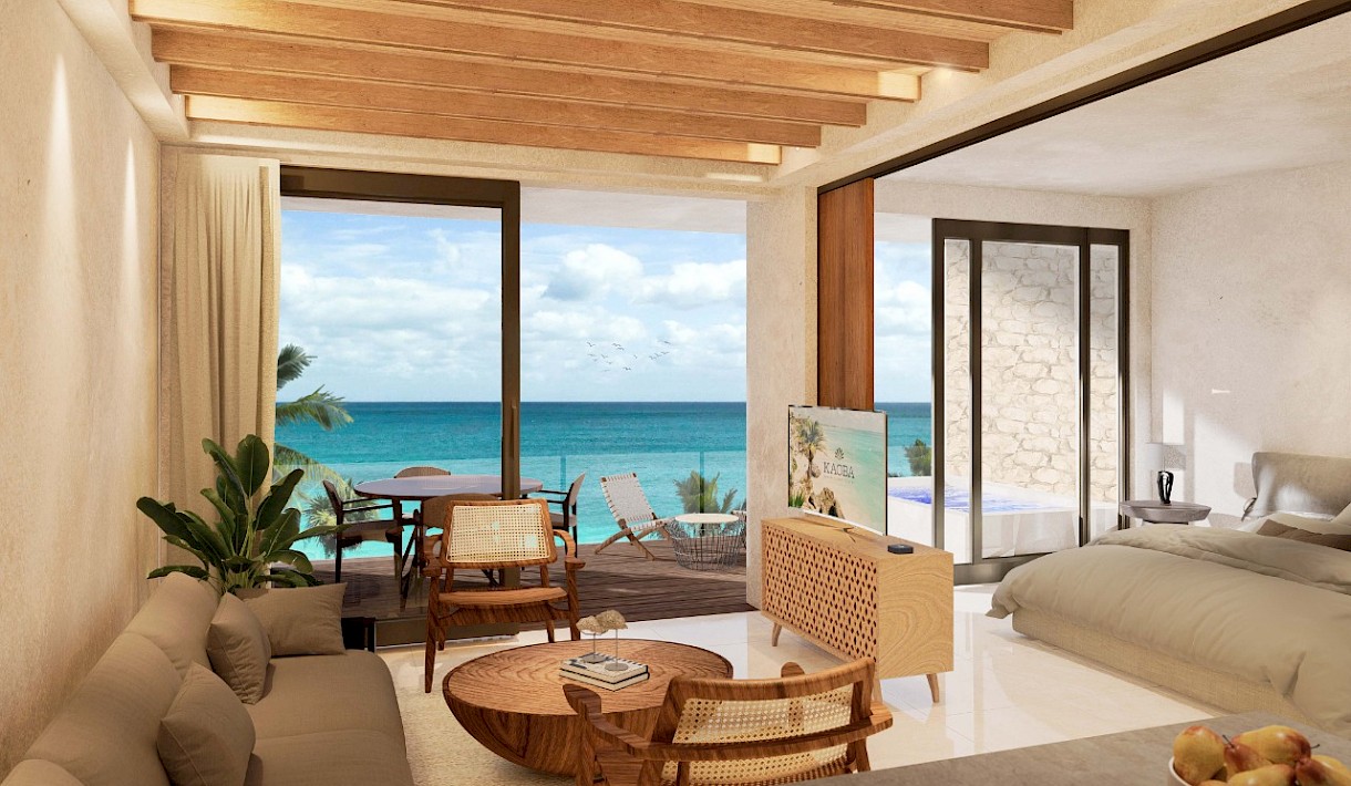 Kaoba is a new eco-luxury condominium development located northeast of Tulum, near the Mayan ruins. Its 11 oceanfront units are surrounded by the sparkling white sand beaches and clear turquoise Caribbean waters of Tankah Bay. Nature lovers will adore the proximity to the ruins of Tulum, Coba and dozens of amazing cenotes that are scattered throughout the Mayan jungle. This new development is just a 45-minute drive from Playa del Carmen and 90 minutes from the airport.