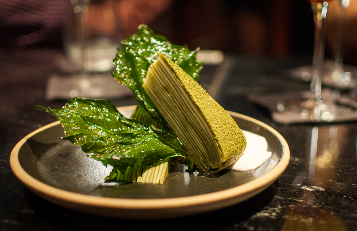 Pastel de crepes: Crepes de matcha y chaya, mousse de queso de cabra y coco, chocolate blanco (Este fue nuestro favorito...)