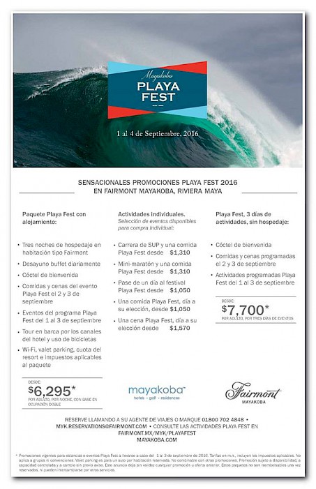 Del 1 al 4 de septiembre de 2016, el resort Mayakoba será anfitrión de un enorme evento diseñado tanto para huéspedes como para locales de la Riviera Maya. Playa Fest incluirá yoga, stand up paddle boarding, clases de cocina y carreras… y todo es para conmemorar el décimo aniversario del hotel Fairmont Mayakoba.