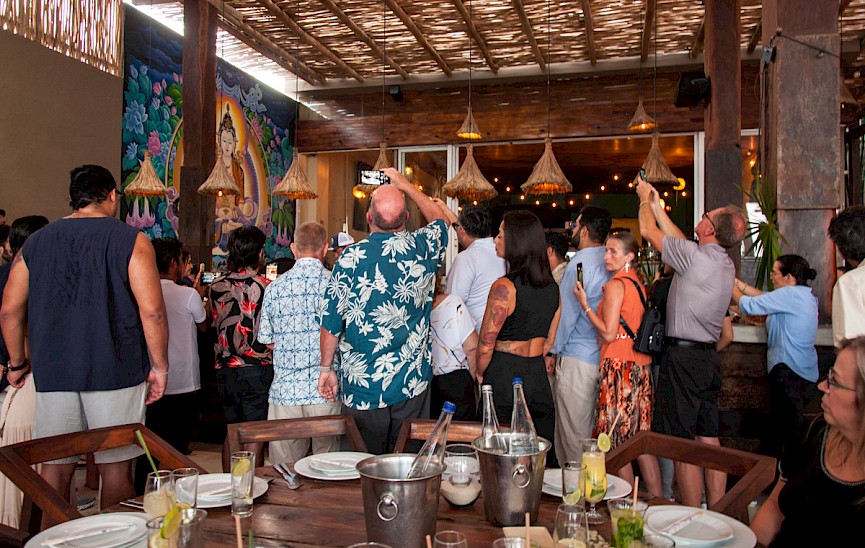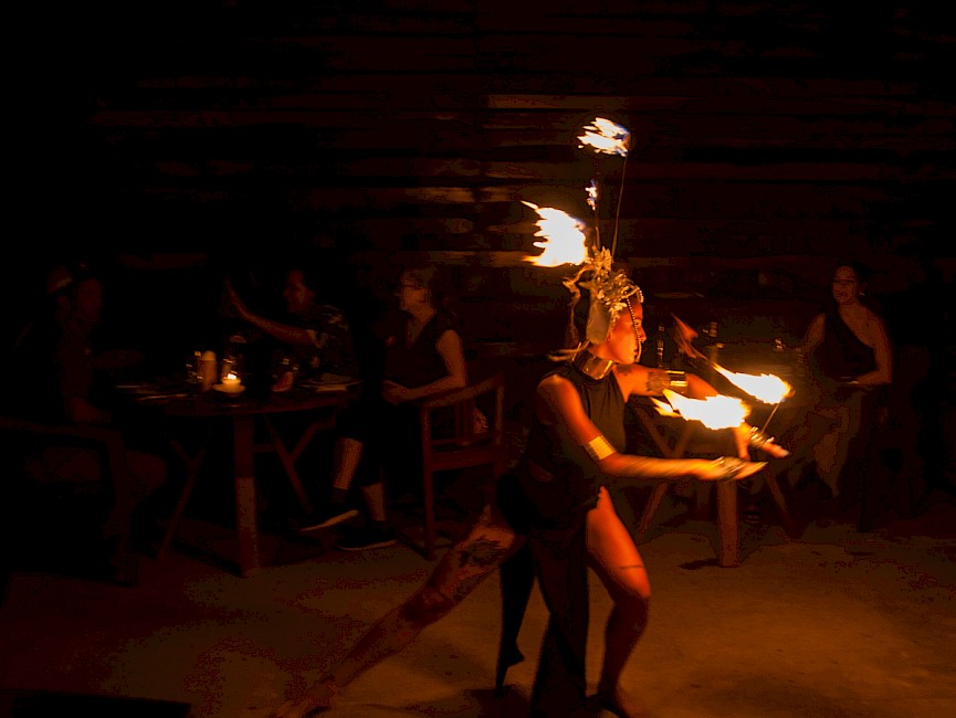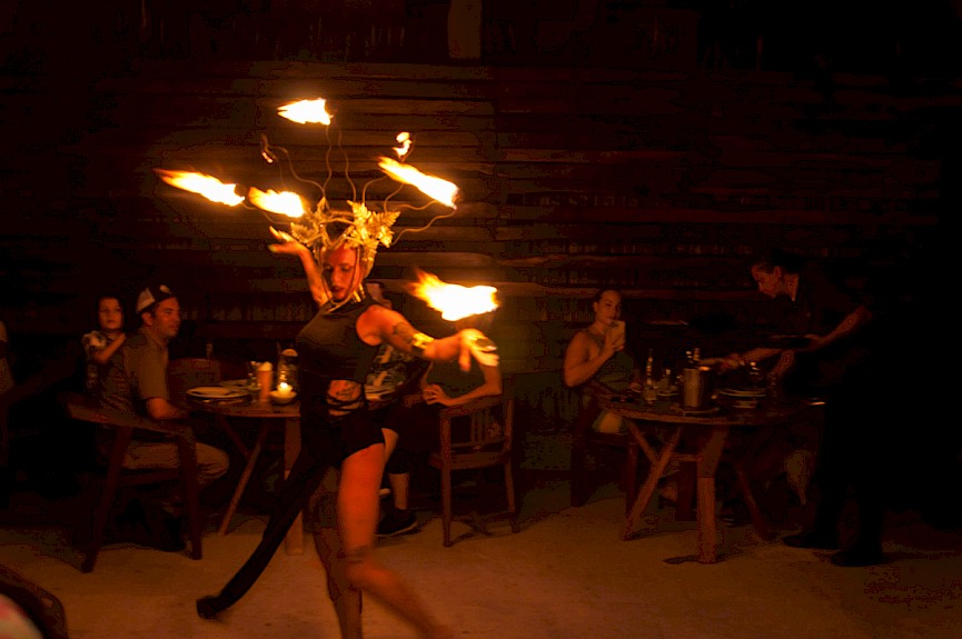 Al final de la velada, disfrutamos de un espectáculo de fuego fascinante, acompañado por los ritmos contagiosos de un DJ. Con el océano iluminado por la luna como telón de fondo, los bailarines se arremolinaban y las llamas danzaban, arrojando un resplandor mágico sobre el entorno frente a la playa. Fue un final apropiado para una velada llena de delicias culinarias y momentos inolvidables.