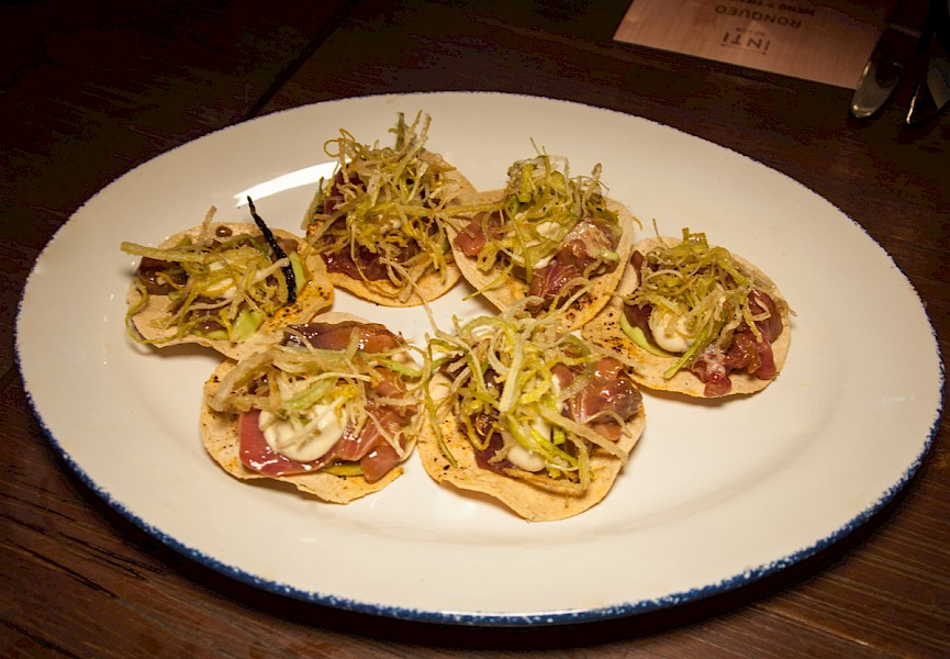 Tostada de Atún Negro: Tostada de maíz con salsa de ostiones, aceite de sésamo, limón, puré de aguacate, chips de puerro y alioli de chile xcatic