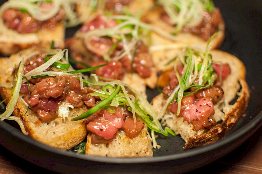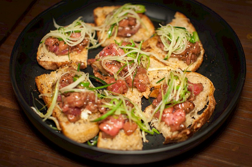 Tartar de atún sobre tostada de masa madre con vinagreta de ajo negro y pimienta morita, pepino y pimienta sishito