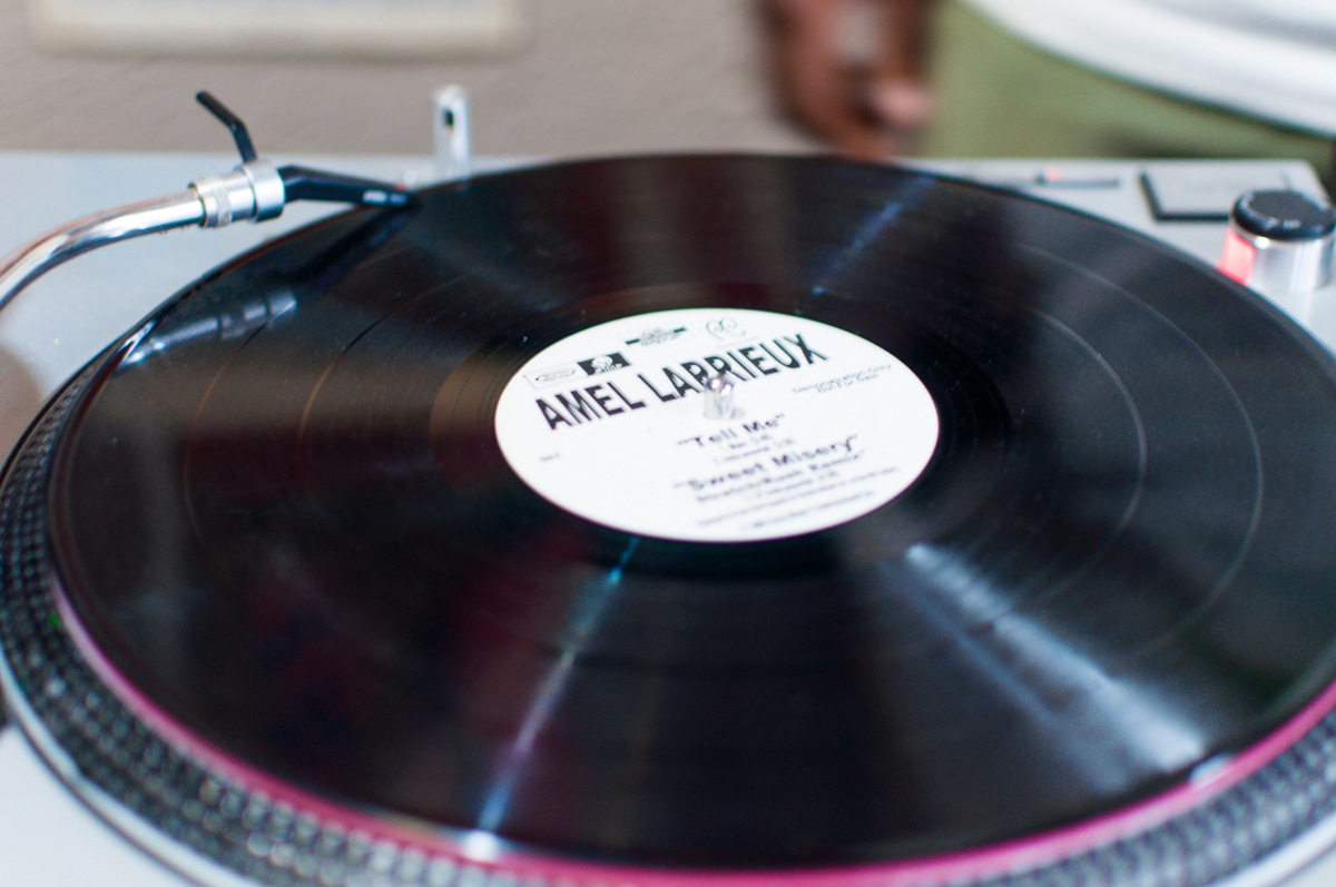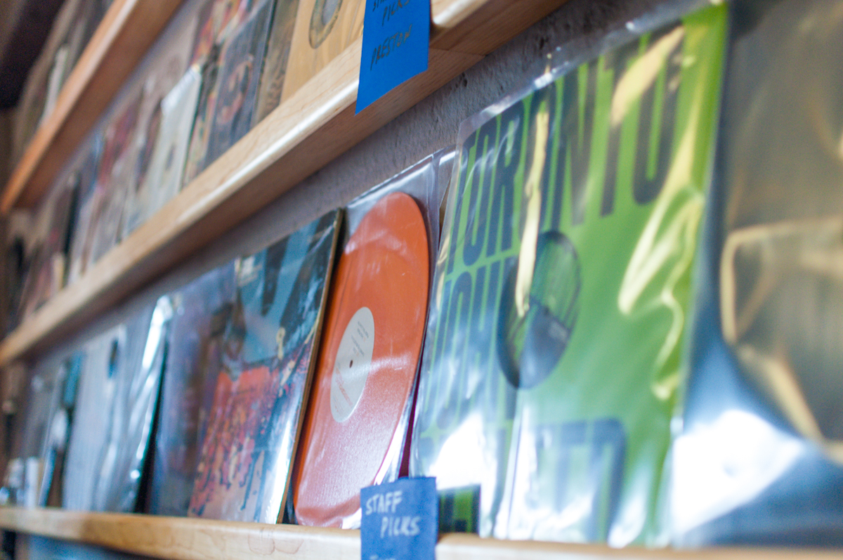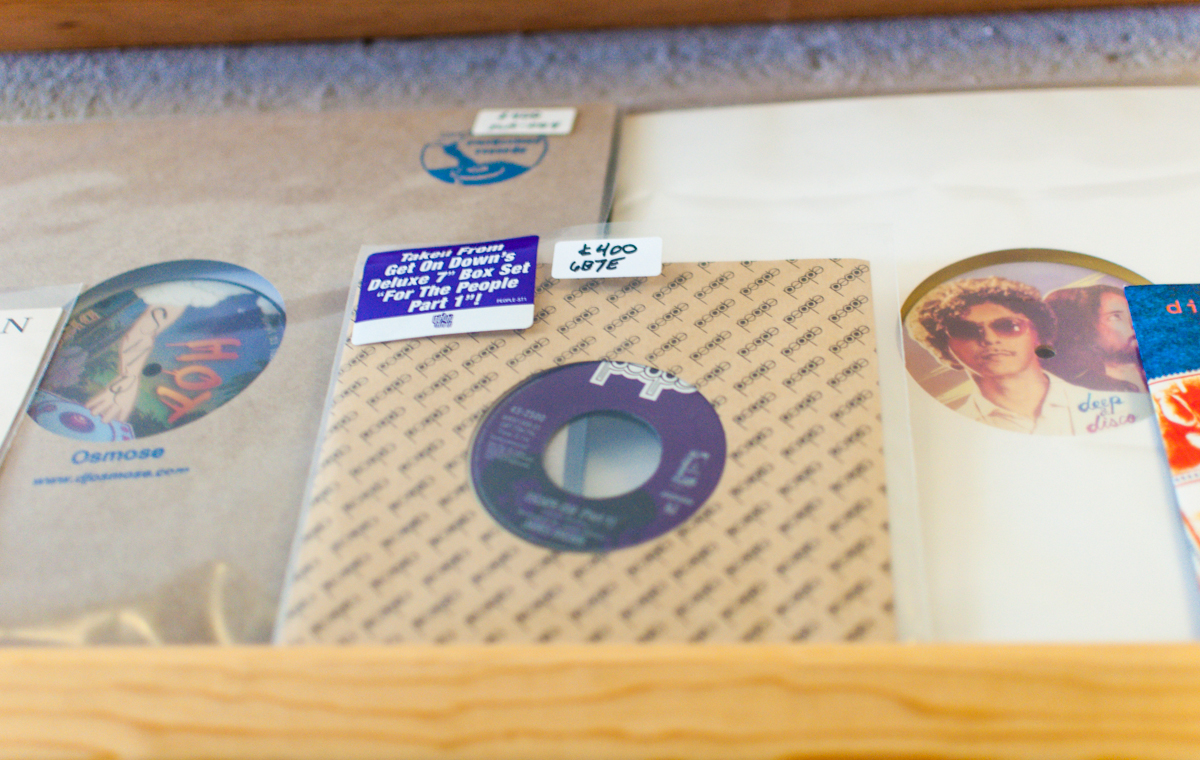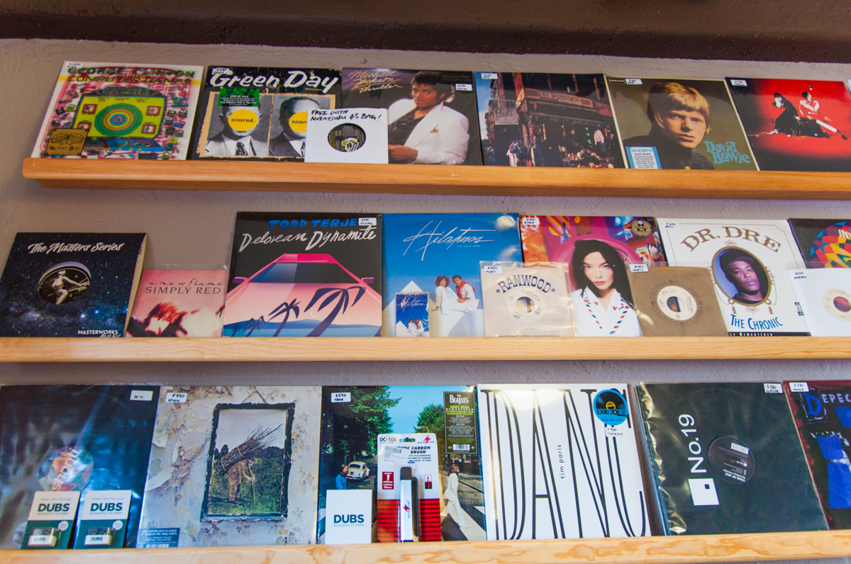 La tienda cuenta con tres estaciones de giradiscos donde los clientes pueden escuchar los discos antes de comprar y eligir sus favoritos.
