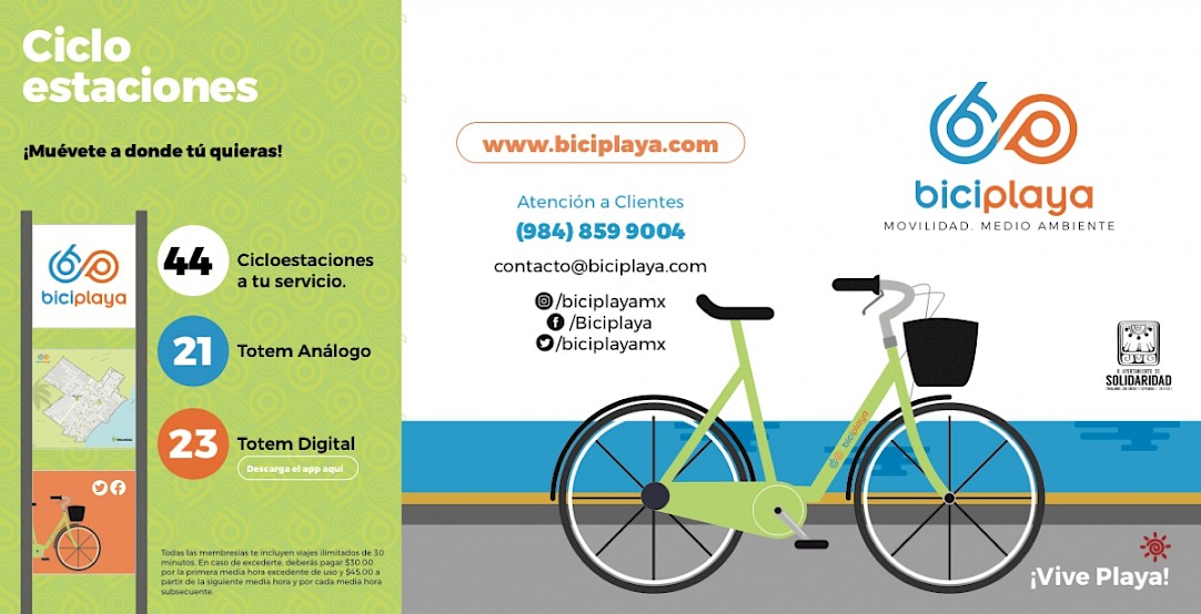 Local residents and tourists of Playa del Carmen will find 500 bikes displayed around town, in 44 bike stations. How to subscribe? You can download the app on your phone, follow all the steps and when you are ready, you go to the nearest bike station, you scan the the QR Code located on the bike, with your phone... et voilà! It unlocks the bike and you are ready for a 30 min ride. It is important to note that this service is offered to use more as a transportation than as leisure.