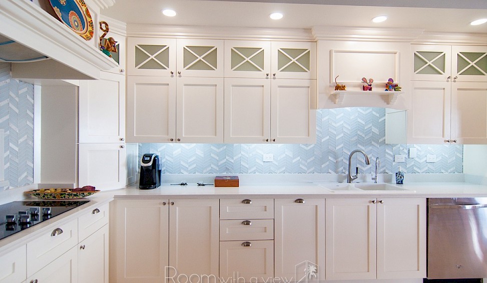 Lots of white with pops of color creates a cool and refreshing coastal vibe. Crisp white cabinetry, a pastel blue and white backsplash that mimics the ocean, and brightly colored ceramics and hand-painted alebrijes give this kitchen a clean, updated look.