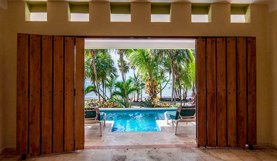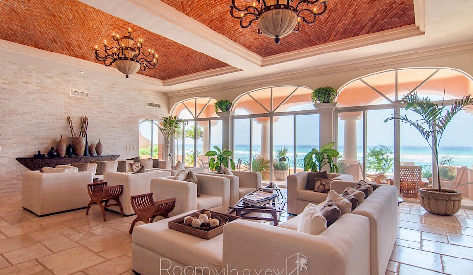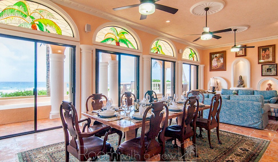 Ditch the draperies and soak in the paradise view. Large sliding glass doors and beautiful stained glass windows with palm tree motifs let in plenty of natural light and give a bright and airy feel to this luxurious Caribbean estate that boasts an impressive 135 feet of private ocean frontage.