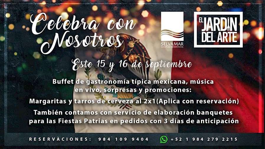 Celebrate Independence Day with a brunch buffet at El Jardin del Arte! There will be traditional Mexican dishes, drink specials and live music. Reservations via phone (984)109-9404 or WhatsApp +52-1(984)279-2215.