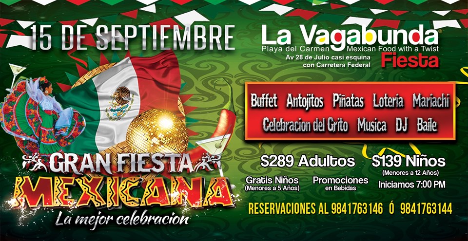 Celebrate Mexican Independence Day with a family-friendly dinner at La Vagabunda. Enjoy a delicious Mexican buffet, music, dancing, and games for kids. The cost is $289 pesos for adults and $139 pesos for kids.