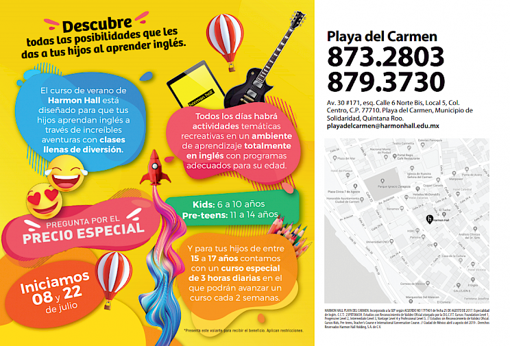 Come learn English the fun way at Harmon Hall! Kids ages 6–10 years and preteens 10–14 years can begin or advance their English skills over the summer. For more info, call (984)873-2803, visit the Harmon Hall Facebook page or email playadelcarmen@harmonhall.edu.mx